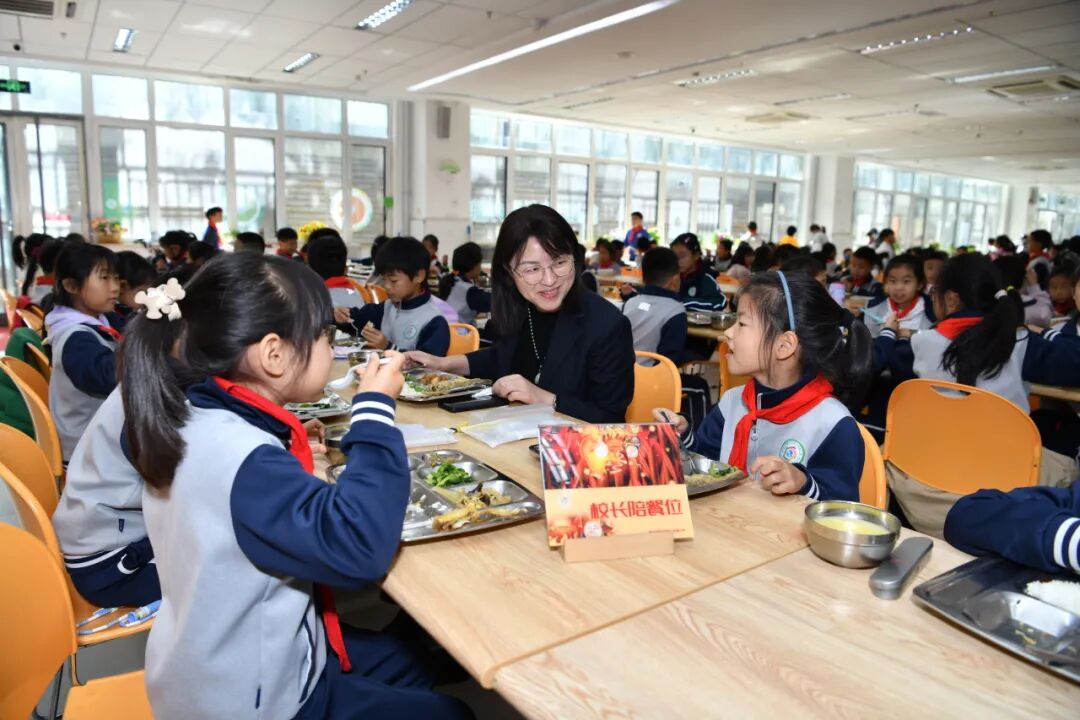 青岛市崂山区第二实验小学校长陪餐,听取学生对午餐的评价,并当天反馈给食堂进行调整。青岛市教育局供图