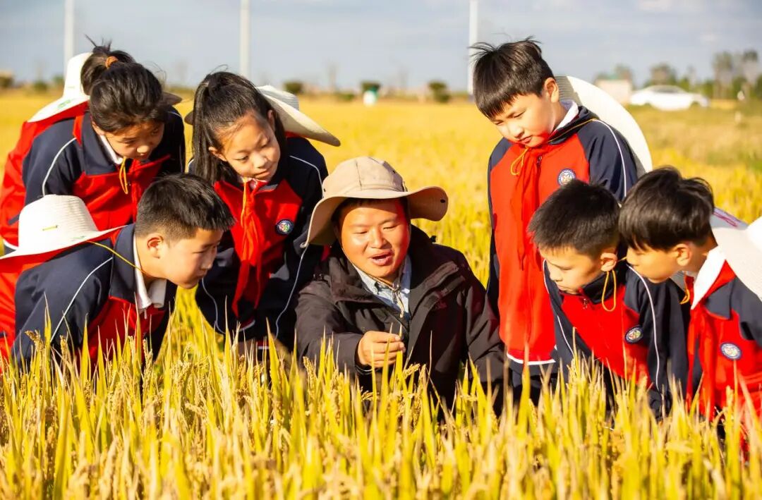 江苏省南通市通州区金沙小学组织学生来到校外田间,听农业技术人员讲解水稻种植知识,让学生了解种粮的艰辛,培养学生们从小树立热爱劳动、爱惜粮食的美德。中国教育报-中国教育新闻网通讯员 翟慧勇 摄