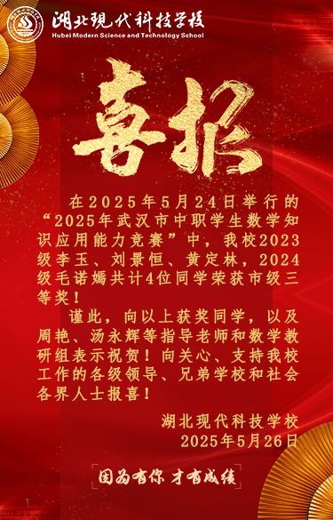 2025年5月24日,“2025年武汉市中职学生数学知识应用能力竞赛” 落下帷幕,湖北现代科技学校参赛学子凭借过硬的专业素养和出色的临场发挥,在众多参赛选手中脱颖而出。我校 2023 级学生李玉、刘景恒、黄定林与 2024 级学生毛诺嫣四位同学,成功荣获市级三等奖,为学校赢得了荣誉。